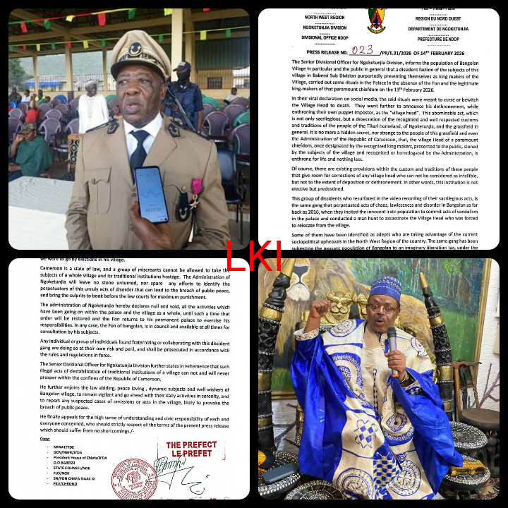In a strongly worded press release dated February 14, 2026, the administration condemned the actions of individuals who allegedly stormed the Bangolan Palace on February 13, 2026, in the absence of the Fon and legitimate kingmakers, and performed rituals purportedly aimed at cursing the traditional ruler to death before proclaiming his dethronement and installing what the administration terms a “puppet impostor.”